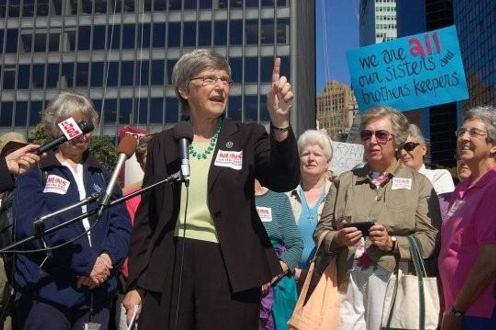 Sister Simone Campbell, SSS is no habit-wearing slump. In fact, she told Stephen Colbert that she and other habit-eschewers were going back to their roots in wearing simple dress in order to be approachable and able to walk with the people. Dressed simply but with flair -- a white blazer rolled up from the wrists and long blue patterned skirt -- the head of NETWORK (A National Catholic Social Justice Lobby) stood before the Democratic National Convention on September 5 and spoke truth to power. NETWORK organized the Nuns on the Bus, a nine-state road trip that Sister Simone described as an opportunity to "stand with struggling families and to lift up our Catholic sisters who serve them." Again and again, they found sad stories, great need and good work, and as Sister Simone told the Democratic party faithful, this "work to alleviate suffering would be seriously harmed by the Romney-Ryan budget, and that is wrong."