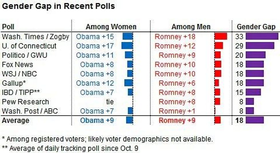 I have been proven wrong. Leave it to Nate Silver's harrowing analysis of the current gender gap in this election (see chart) to slap away any notions of gender equality, the idea that the men and women of America might, just might, have found some semblance of parity, and progress, with the only extant difference being education, intellectual attunement and economic concern.