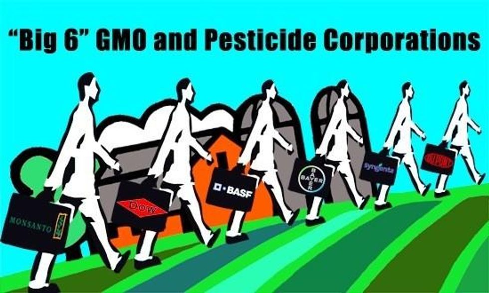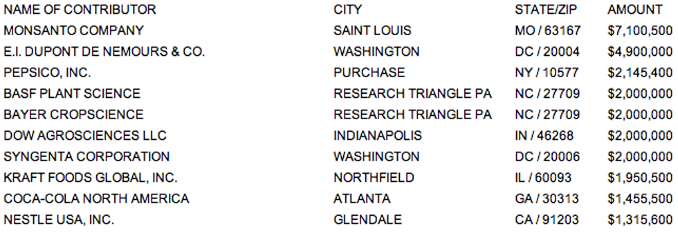 Among the campaign's largest funders are the "Big 6" GMO and pesticide corporations: BASF, Bayer, Dupont, Dow Chemical Company, Syngenta, and Monsanto (see the chart below this article). These six corporations dominate the world's seed, pesticide and genetic engineering (GE) industries. Collectively they have contributed more than $20 million to oppose the labeling measure.