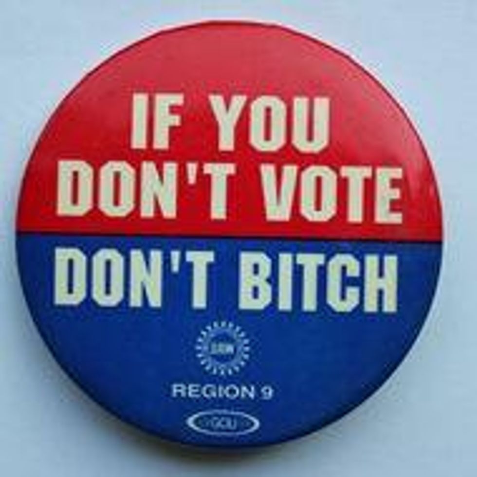Steve Earle put a slogan on one of his records: "If you don't vote, don't bitch." He's right. And here's a new slogan: "If you do vote, do bitch" - although "bitch," in this case, means "make your voice heard." Vote, of course. And after that, the hell with learned helplessness. We can't let this country go to the dogs.