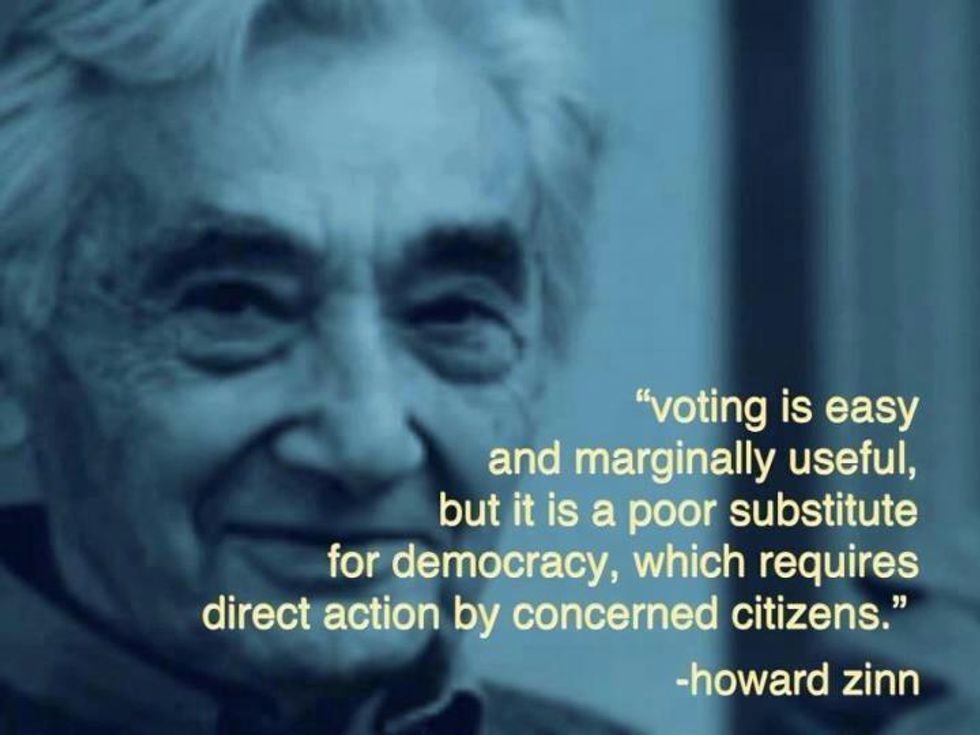 Voting once every two or four years is not exercising civic duty, it is imaginative play that supports a particularly hollow concept of democracy embraced in America. As author and philosopher Howard Zinn movingly stated in a 2008 opinion-editorial for The Progressive, "Voting is easy and marginally useful, but it is a poor substitute for democracy, which requires direct action by concerned citizens."