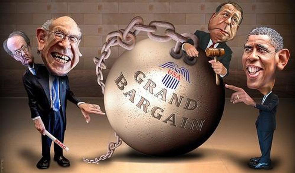 Congress is still talking about a "Grand Bargain" that "balances" far more spending cuts than tax increases. That is another way of saying that you - the consumer of Medicare and Medicaid services, the recipient of Social Security, and the average taxpayer will take the brunt of the spending cuts, while the wealthy get their income taxes restored, not raised, to their pre-Bush modest levels. Don't buy it!