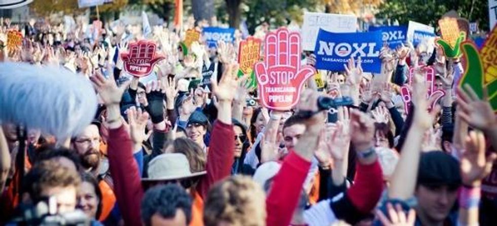 There's a new sense of momentum in the campaign against Keystone XL. We pressed the button on an email announcing today's protest a few minutes after the networks called the election for President Obama. In just 10 days, thousands of people have signed up to come to the capitol. Volunteers have helped organize buses from New York City, Philadelphia, Michigan, and Ohio.