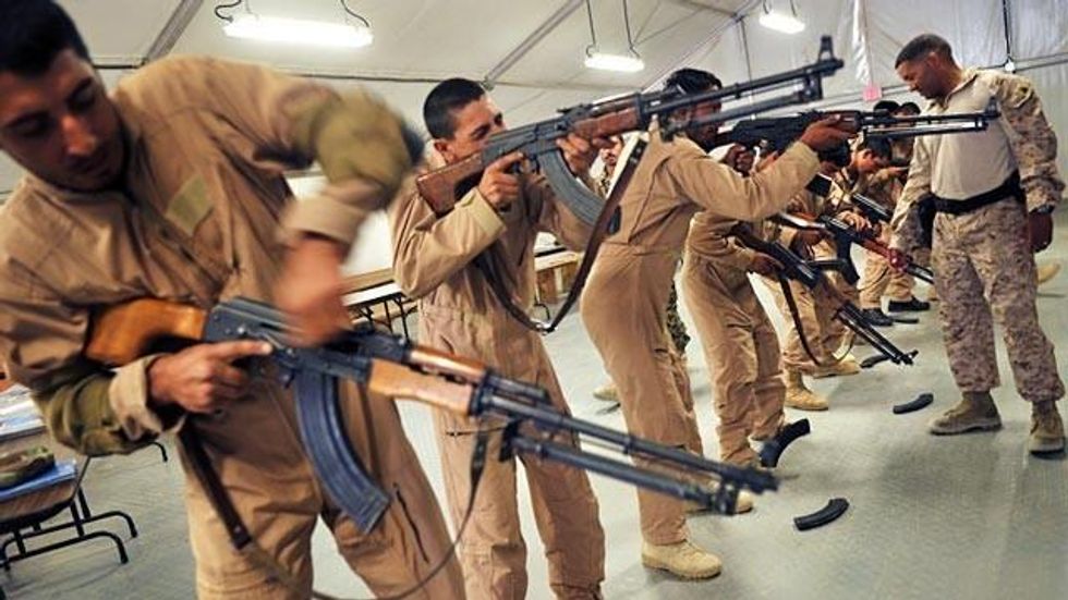 The notion that these 10,000 post-2014 soldiers would just be "training" the Afghan military is simply absurd. Parris Island, the famed boot camp in South Carolina for the US Marine Corps, which boasts what probably is the toughest training program of any of the branches of the US military, churns out 17,000 new Marines a year with a training unit of 600 uniformed personnel. That's one trainer per 170 recruits. At that rate, the 10,000 US "trainers" in Afghanistan could be training 1.7 million new recruits for the Afghan army each year! Even allowing for the typical top-heaviness of the US military, if only a third of those 10,000 "trainers" were actually drill sergeants and their staff, we're talking about a training force capable of producing over 500,000 new Afghan soldiers per year! But Afghanistan's army today, which the US claims is already largely trained and ready to protect the country, has only a total of some 200,000 active duty soldiers altogether.