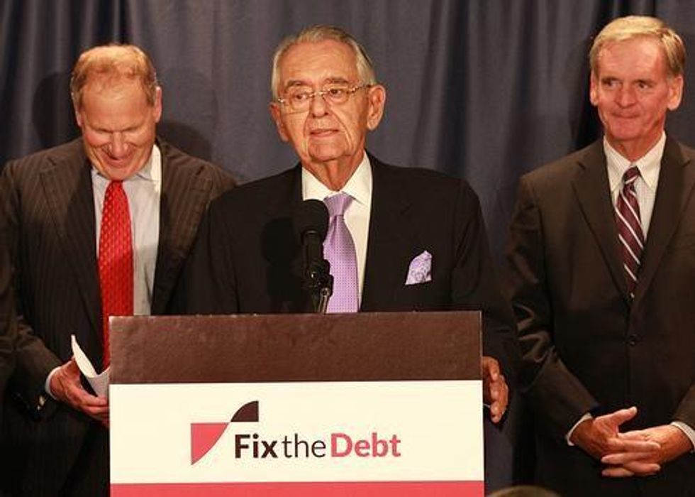 That commission proved unable to reach a budget-fixing consensus. No problem. Peterson dollars were soon funding a new public relations campaign that sent the commission co-chairs, former GOP senator Alan Simpson and former Clinton chief of staff Erskine Bowles, barnstorming around the nation.