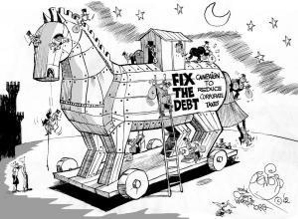 In late October, the Institute for Policy Studies began exposing the Fix the Debt campaign's Trojan Horse. While they presented themselves as a patriotic bipartisan group, merely seeking a "balanced" deal, their own lobby materials revealed they were out to use the fiscal cliff as an opportunity to win massive new corporate tax breaks paid for with cuts to earned benefit programs like Social Security and Medicare.