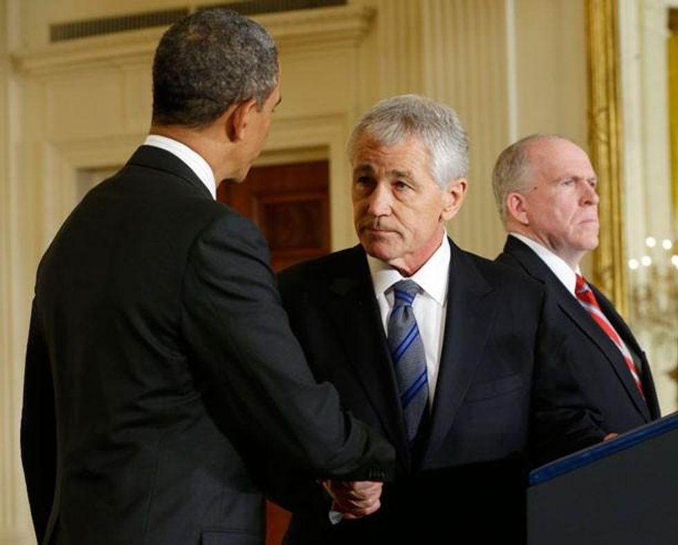 The neocons also have it in for Hagel because he was one of the first Republicans to criticize their favorite project, the war in Iraq. Of course he voted to fund it every chance he got--he's no peace activist. But Hagel broke politically with George W. Bush and his own party, calling Bush's foreign policy "reckless," and called Bush's 2007 "surge in Iraq "a ping-pong game with American lives." He didn't, however, express any concern for Iraqi lives, nor did he ultimately vote against the war--either in 2002 at the moment of the crucial authorize-the-war vote, or later when funding bills came before him. As David Corn wrote in 2002, Hagel "cautioned humility: 'I share the hope of a better world without Saddam Hussein, but we do not really know if our intervention in Iraq will lead to democracy in either Iraq or elsewhere in the Arab world.' Bottom line: Hagel feared the resolution would lead to a war that would go badly but didn't have the guts to say no to the leader of his party."
