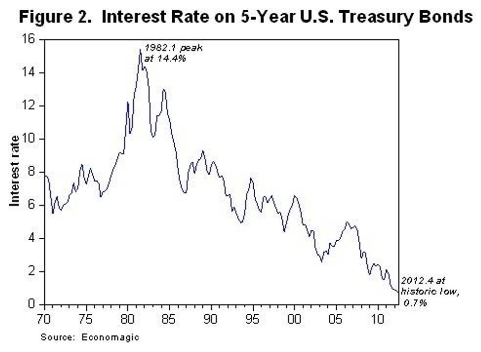 Figure 2 tells this story, which is well-known, but is not being given proper recognition in the deficit debates. As the figure shows, at the end of 2012, the U.S. government was borrowing at 0.7 percent on its 5-year Treasury Bonds.