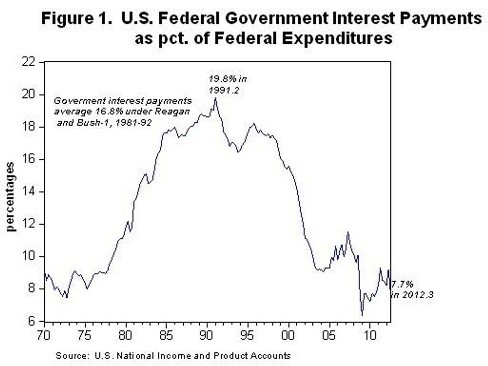 The deficit has fallen modestly since 2009, to 8.5 percent of GDP in 2012. But the single most important thing we can do to lower the fiscal deficit further is to push unemployment down. This will generate increased government revenues with people paying more in income and sales taxes, and it will reduce government payments on unemployment insurance and supplemental aid for health care and family support. The U.S. has the capacity to pursue a stimulus agenda now quite easily, precisely because interest rates and interest payments to creditors remain historically low.