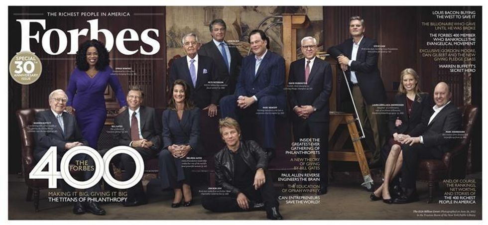 By sitting on their growing investments, the richest five Americans made almost $7 billion each in one year. That's $3,500,000.00 per hour. The minimum wage for tipped workers is $2.13 per hour.