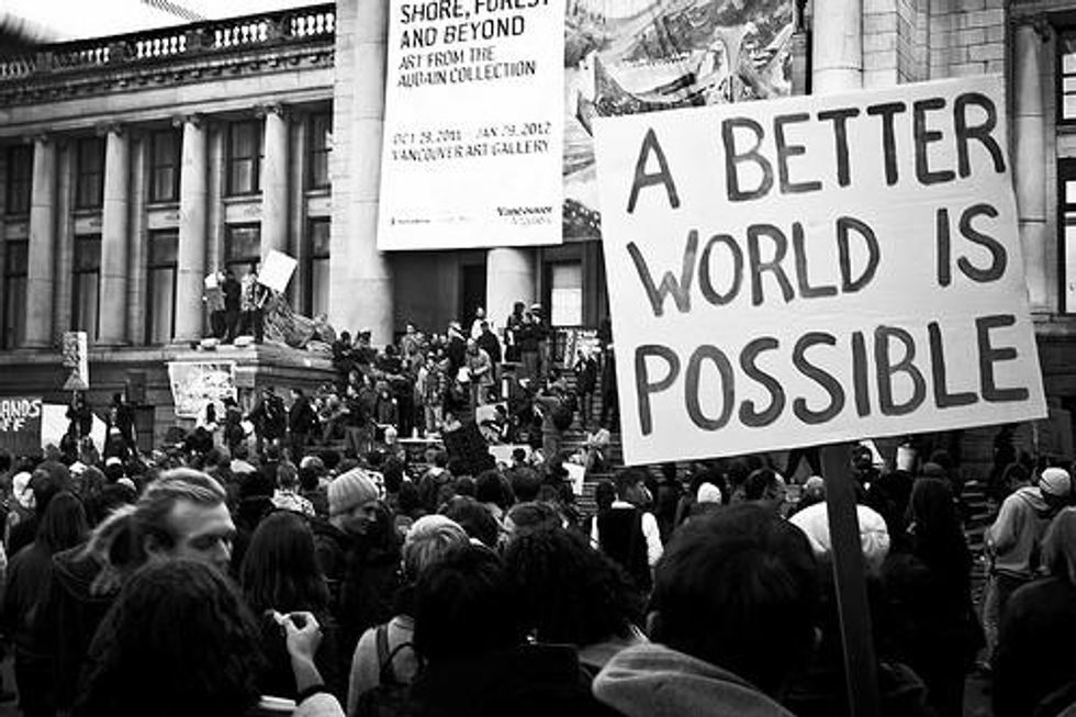 The best we can hope for is "green" and "ethical" capitalism. The logic of this belief is fundamentally flawed because it assumes that within capitalism, businesses can prioritize anything above the bottom-line. In actuality, businesses that commit themselves first and foremost to being truly and fully ethical and green will find it very difficult to stay in business. Of course there are great models of ethical business -- worker-owned organic farms, for instance -- but these cannot thrive and become the dominant norm when they are functioning within an economic structure that concentrates wealth and power in the hands of Monsanto. And while we should support these alternatives that exist within capitalism, we need to recognize that it's way too little, way too late -- structural change must (and will) happen, one way or another.