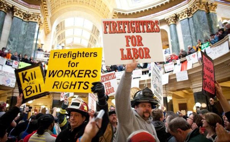 But that does then raise the question: why is the unionization rate falling when being a union member does convey significant benefits to workers? The short-term answer is straightforward: that business interests and Republican politicians have advanced a vicious campaign to destroy unions. As the Times story notes, union membership fell by 13 percent in Wisconsin and by 18 percent in Indiana last year. These declines are tied to the fact that Wisconsin passed a law in 2011 curbing the collective bargaining rights of many public employees, while Indiana enacted a right-to-work law, which enables workers to receive the benefits of union contracts without having to join the union. Michigan also became a right-to-work state in December 2012, sneaking through the legislation during an end-of-year lame duck session.