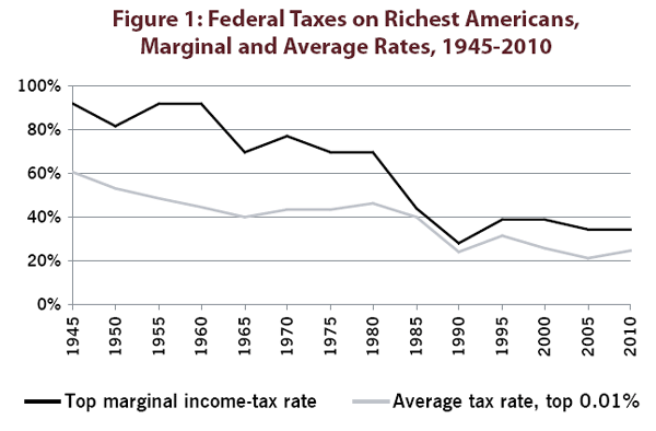 Falling Tax Rates for the Richest: The federal government has been cutting taxes on the richest Americans since the end of World War II. The average tax paid by the richest taxpayers, as a percentage of income, is typically less than the top marginal rate. Some of their income (the portion below the threshold for the top marginal rate, any capital-gains income, etc.) is taxed at lower rates. Some is not subject to federal income tax because of deductions for state and local taxes, health-care costs, and other expenses. The decline in the average tax rate for the richest, however, does follow the cuts in the top marginal income-tax rate. (See Figure 1.)