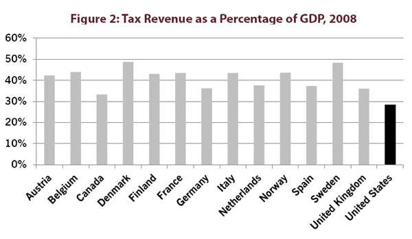 Comparisons with Other Countries: Americans pay a smaller proportion of total income in taxes than do people in any other advanced capitalist economy. As recently as the late 1960s, taxes accounted for as high a share of national income in the United States as in Western European countries. After decades of tax cuts, however, the United States now stands out for its low taxes and small government sector. (See Figure 2.)