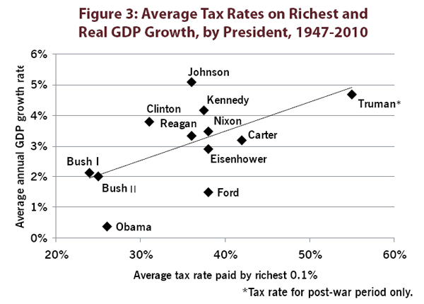 Higher Growth When Taxes Are Higher: On average, the economy has grown faster during presidential administrations with higher tax rates on the richest Americans. Growth was unusually slow during George W. Bush's two terms (Bush II) and during Obama's first term, when the Bush tax cuts remained in effect. On average, every 10 percentage-point rise in the average tax rate on the richest has been associated with an increase in annual GDP growth of almost one percentage point. (See Figure 3.)