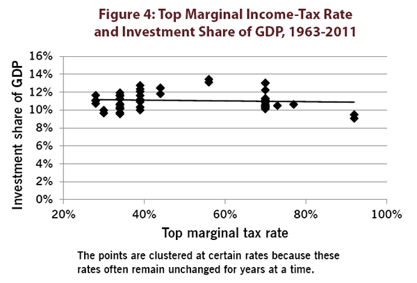 Declining Tax Rates Haven't Stimulated Investment: Cutting taxes on the richest Americans has not led them to invest more in plant and equipment. Over the past 50 years, as tax rates have declined, there has been no increase in investment spending as a percentage of GDP. (The flat trend line shows that changes in the highest marginal income-tax rate have not affected investment much, one way or the other.) Instead, the investment share of the economy has been determined by other factors, such as aggregate demand, rather than tax policy. (See Figure 4.)