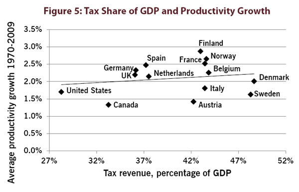 Lower Taxes, Slower GDP Growth: Despite lower and declining tax rates, especially on the rich, the United States has had slower productivity growth over the last several decades than other advanced economies. Overall, lower taxes are associated with slower growth in GDP per hour worked. A 10 percentage point increase in taxes as a share of GDP is associated with an increase in the productivity growth rate of 0.2 percentage points. (See Figure 5.)