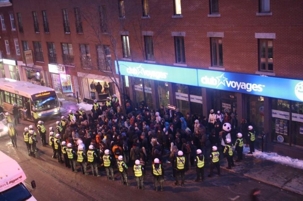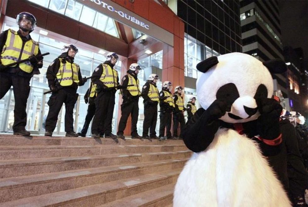 Curtis never replied, no doubt caught up in extricating himself from police custody, so allow me to do so now: yes Josee, they really, actually did. Just call him Arrestopanda. At night's end the tally ran something like this: one panda, several rabbits, a few dozen journos and almost three hundred dull normals cuffed, processed and slapped with $637 fines. This after being held for hours in the cold kettles Montreal police formed around them.