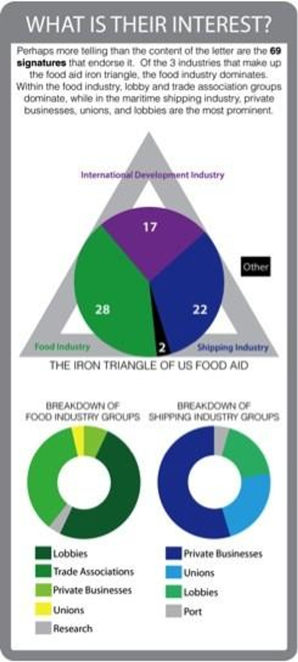 The letter in question makes several accurate statements yet omits the true impacts of food aid on recipient countries. It does, however, contain one lie, stating that PL 480 facilitates "developmental programs to end the cycle of hunger," when in fact it propagates it. Hunger is big business. Food for Peace ends up looking a lot more like Food for Profit. The letter ends with one final truth, declaring that food aid programs are "some of our most effective, lowest-cost national security tools." By handicapping local food markets across the world, food aid keeps poor countries poor and compliant, and provides US-based companies with dependable markets for the dumping of surplus food commodities when global grain prices are low. Rice and wheat cost a lot less than bombs.