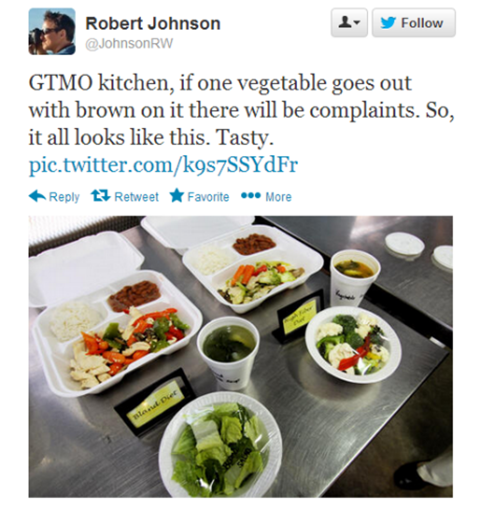 Upon his return, Johnson - before writing this latest article devoted to debunking the validity of the detainee hunger strike - posted a series of frolicking observations about the happy life of detainees at the camp; here's one illustrative example of many:
