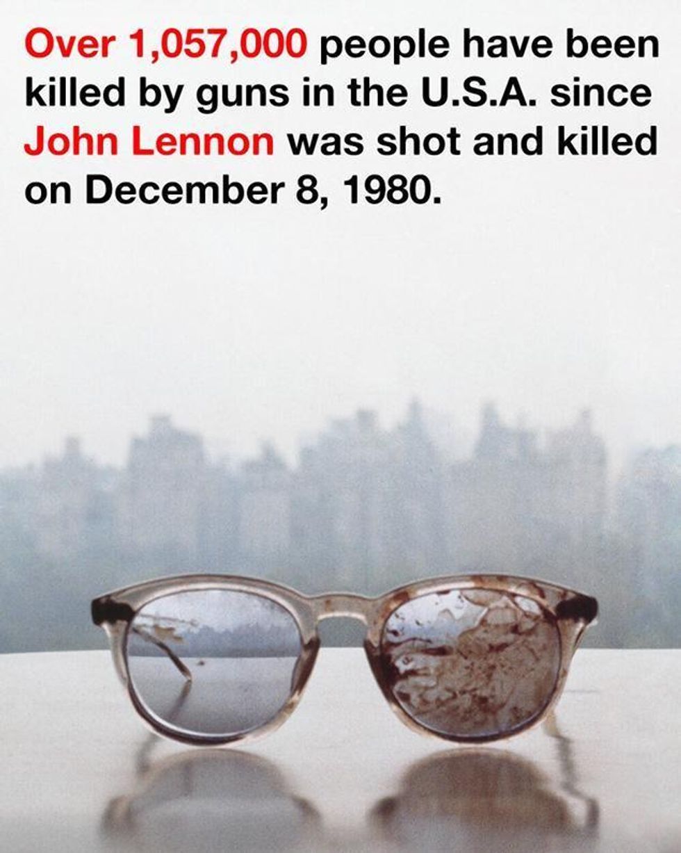 How could any of us see the photo of John Lennon's blood covered eyeglasses released by Yoko Ono recently and not mourn the senseless gun related deaths numbering over a million souls since December 1980 when Lennon was gunned down? The right to carry guns and "defend" oneself seems to have trumped the right to be safe and secure when we walk down the street or send our children to school or see our teenagers off to work at a local pizza parlor.