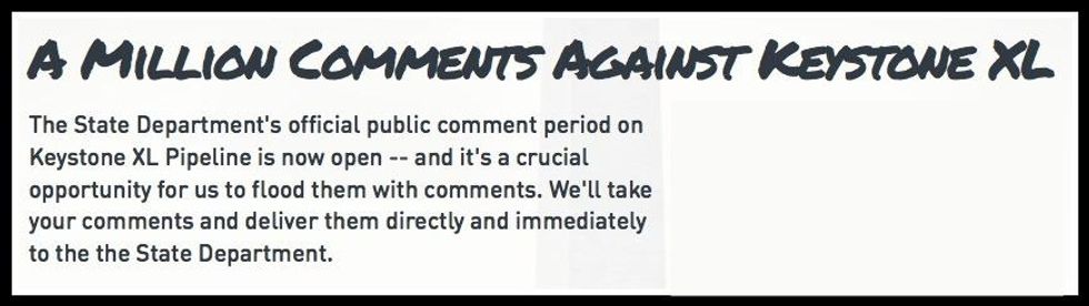 350.org, which helped plan a mass rally in Washington, DC on President's Day and mass arrests last year to protest the planned pipeline, now wants to flood the State Department with one million substantive comments from citizens. Learn more here.