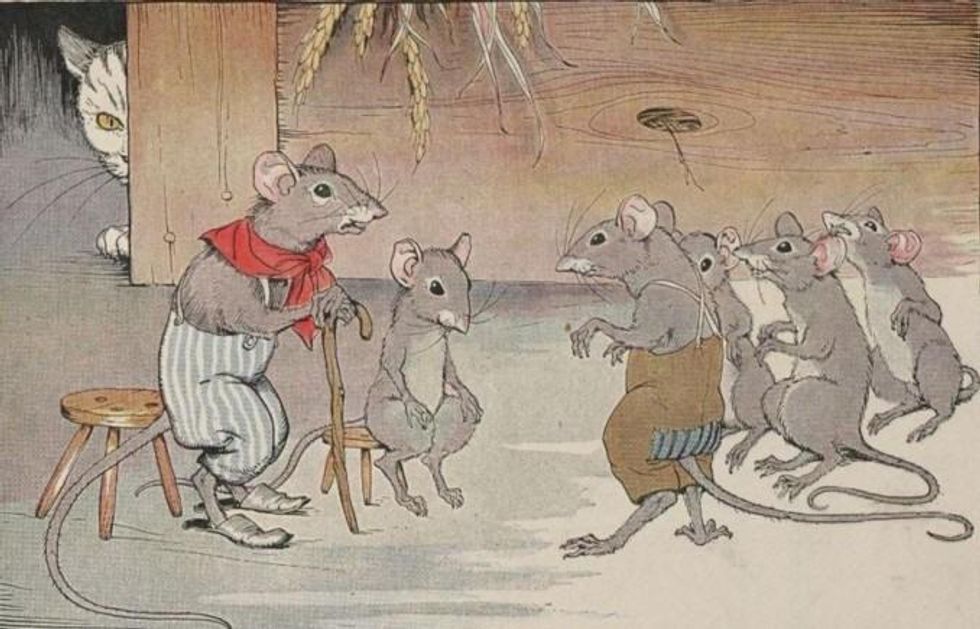 The story goes that some mice became very upset about the cat in the house and convened an emergency meeting. They finally came up with the idea of tying a bell around the cat's neck, so the dangerous feline could no longer catch victims unawares. The plan gained a lot of enthusiastic praise, until one mouse piped up with a question that preceded a long silence: "Who's going to bell the cat?"