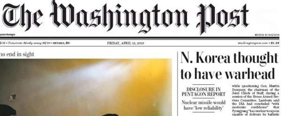 The panicky style of reporting on North Korea doesn't seem to be changing much, if you glance at the front pages of the big papers this morning. The Washington Post headline (4/12/13) blares, "N. Korea Thought to Have Warhead, " while over at the New York Times (4/12/13) it's "Pentagon Says Nuclear Missile Is in Reach for North Korea."