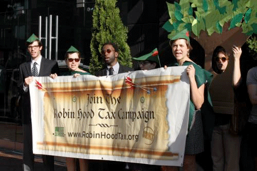 The good news: A set of groups in the United States has joined allies in Europe and around the world to call for financial speculation taxes to curb speculation while raising hundreds of billions of dollars to fund jobs, climate-saving innovations, public health, and the like. In the United States, groups as far-ranging as National Nurses United, HIV/AIDS activists, and climate justice groups have come together behind such a tax, often called a Robin Hood tax. In early April, activists dressed as polar bears joined others clad in the Robin Hood green to protest a meeting of financial officials in Washington. This is hardly a pipe dream. Citizen pressure has compelled eleven European Union nations to agree to initiate such a tax as early as 2014.