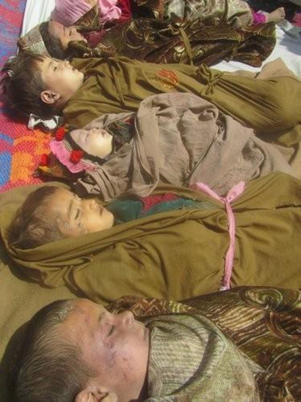 The twelve children belonged to eight families from the same village. When the villagers found the bloodied and dismembered bodies of their children, they gathered together to demand from the provincial government some reason as to why NATO forces had killed them. "It was a mistake," they were told.