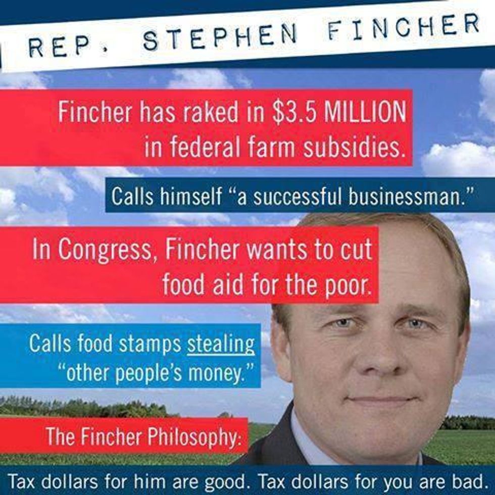 While Fincher cites chapter and verse to prove that it is immoral for out of work folks to mooch off government largesse, he fails to mention that his own fingers have been observed in the public till. But not for the sake of a measly loaf of bread or carton of milk, mind you. No, the good congressman is one of Tennessee's largest-ever recipients of farm subsidy payments-- otherwise known as "Big Ag's Food Stamp program."