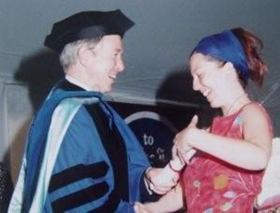 There are no caps and gowns at Hampshire College. At least not when I graduated 16 years ago. I wore a long red dress with blotches of other colors and a bright blue scarf around my head (it was the 90s, people did stuff like that back then). I don't remember much of the ceremony, except that it was really long and too cold to be wearing a sleeveless dress. My brother missed his flight and showed up just in time to see me walk. We all missed the post-graduation parties because we drove up to Maine to see my dad in jail that night, who was awaiting sentencing for a Plowshares action at Bath Iron Works.