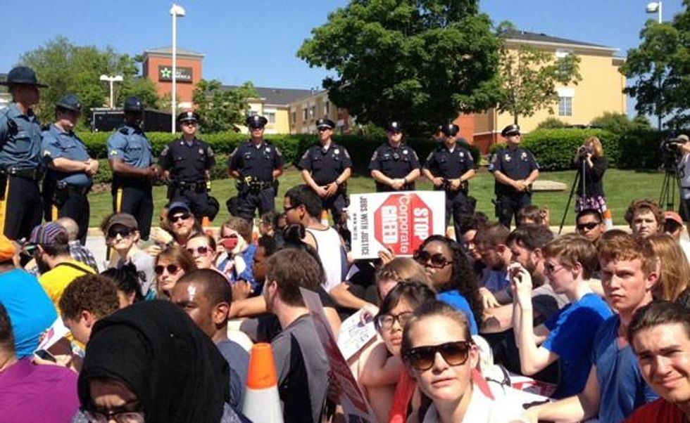 Outside of Sallie Mae's corporate headquarters, the activists were met by "dozens of police, blockades and K-9 units," according to participants. Sarita Gupta, executive director of Jobs with Justice & American Rights at Work, urged the crowd to confront Sallie Mae executives and board members "about their role in America's student debt crisis."