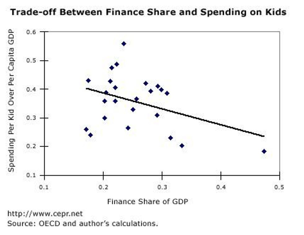 While there may actually be no tradeoff between spending on seniors and spending on kids, there do appear to be other tradeoffs. For example, if we look at the share of GDP devoted to finance we find solid evidence of an inverse relationship with the willingness to support children.