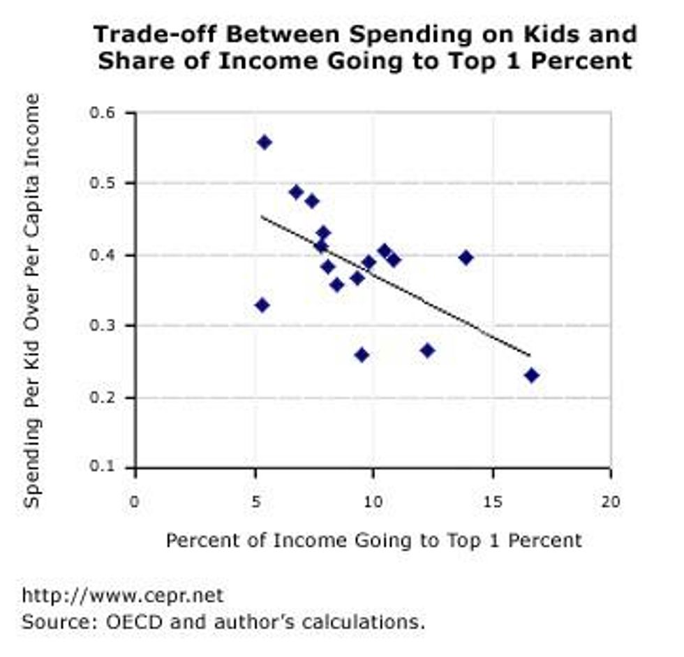 This chart again shows a clear negative relationship, this time between the share of income going to the richest 1 percent and the amount of money that governments are willing to spend on kids. This may suggest that the richest 1 percent are not happy about supporting other people's children through the government. In that case, the more money they are able to control, the less is likely to go to kids.