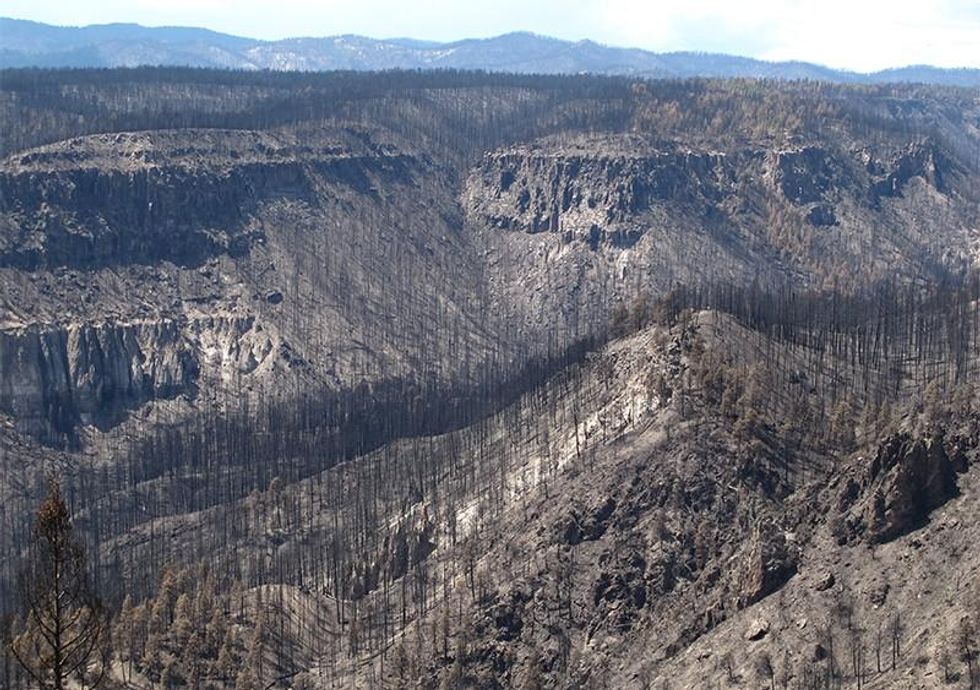 Making matters worse in the near-term, forests hit by so-called "stand-destroying" wildfires may not recover. During a recent phone interview, Craig Allen, a co-author of the Nature paper and a USGS research ecologist at the Jemez Mountain Field Station near Los Alamos, explains that the catastrophically hot fires seen recently in New Mexico, while a natural result of a century of fire suppression and dense growth during wet periods, create conditions for permanent forest loss through "type conversion." Basically, high severity fires that burn over a wide area subvert the ability of southwestern conifers to reproduce, a process requiring nearby mother trees to drop their seeds. Ponderosa pines, for example, can't cast their seed much more than 100 yards, virtually ensuring that large forest gaps will be replaced by shrub and grasslands, with unfortunate consequences for a range of forest services, particularly those provided by delicate watersheds. "These anomalously big patches where every tree is killed create a high risk that they won't come back as forests," Allen says.