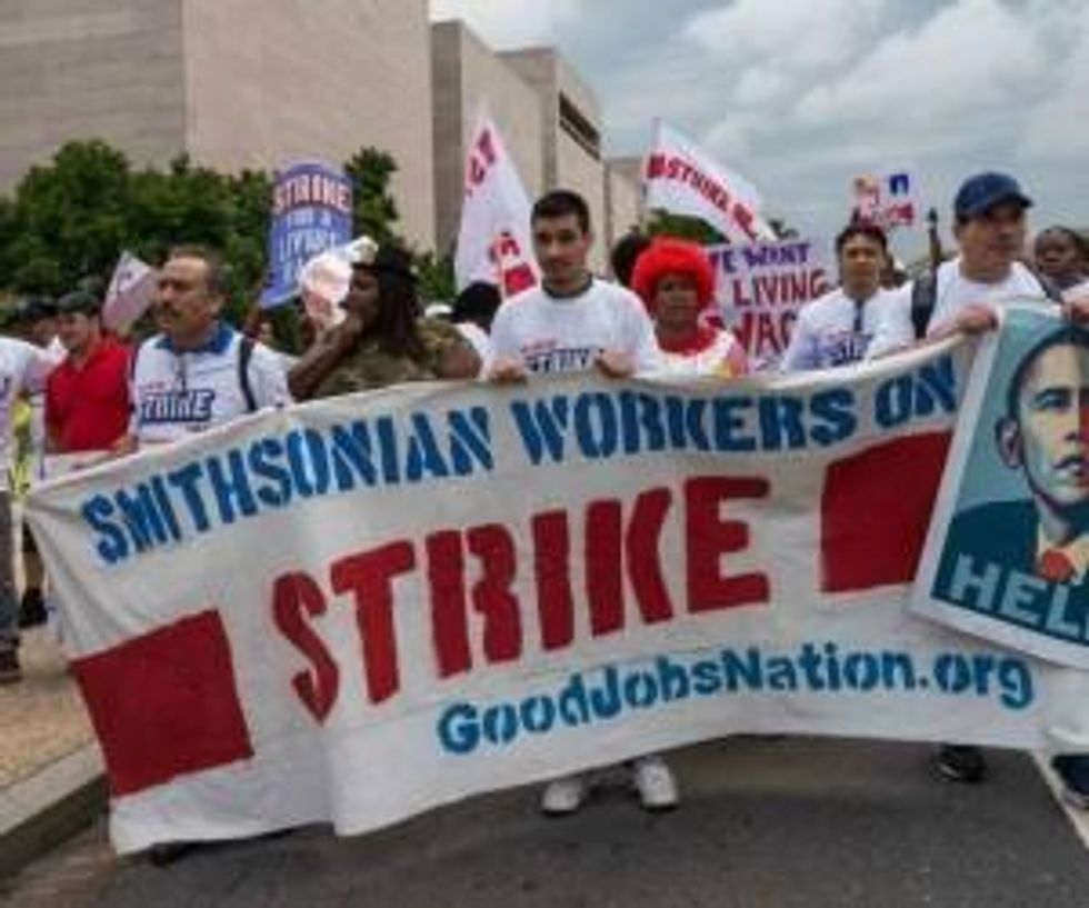 In Washington, some of them are standing up. On Thursday, July 18, federally subcontracted concessions workers at Union Station briefly walked off the job. It was the third such strike in eight weeks - others took place at the Smithsonian and the Ronald Reagan Building - organized by the Good Jobs Nation campaign that, according to the ThinkProgress website is "pressuring the government to stop paying poverty wages through its private-sector partners." The walkout at the Reagan building actually has triggered a Labor Department investigation into whether employers at the building's food court owe their workers as much as a million dollars in back wages and damages.