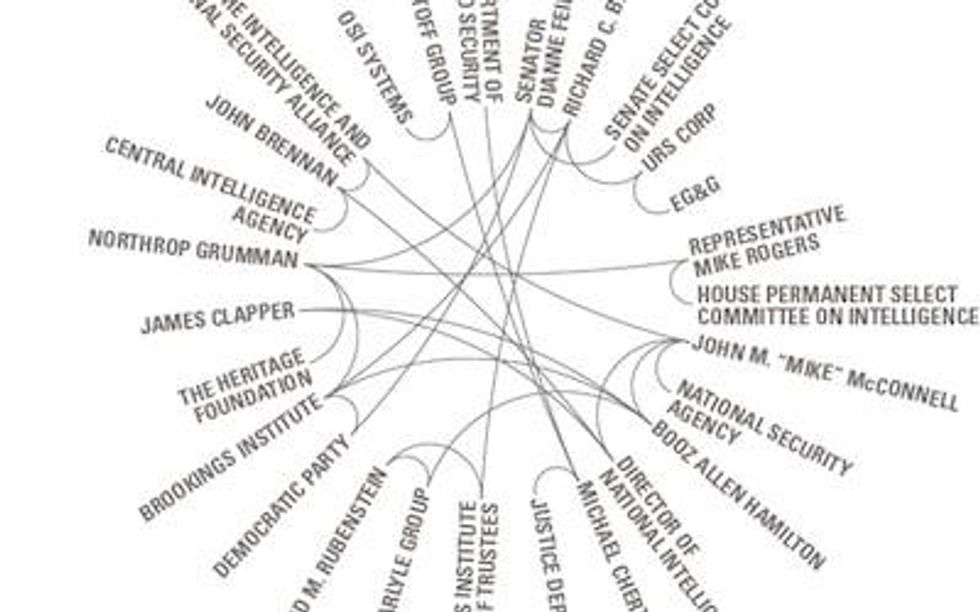 Since the 9/11 attacks, the United States has witnessed the rapid growth of an intelligence-industrial complex that fuses government and corporate power. According to the Project on Government Oversight, $300 billion a year is now spent on a "shadow government of private contractors." At the center of this arrangement is an interlocking web of current and former high-level government officials, major corporations, D.C. think tanks and other inside-the-Beltway operators who have benefitted from the rise of the surveillance state. Here are a few of the most notable: