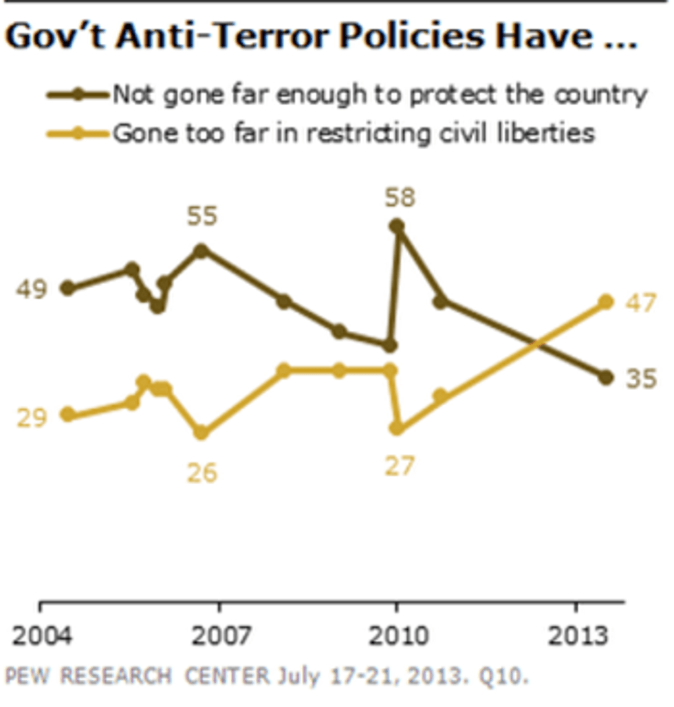 "Overall, 47% say their greater concern about government anti-terrorism policies is that they have gone too far in restricting the average person's civil liberties, while 35% say they are more concerned that policies have not gone far enough to protect the country. This is the first time in Pew Research polling that more have expressed concern over civil liberties than protection from terrorism since the question was first asked in 2004."