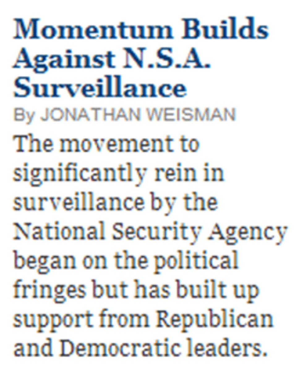 Perhaps more amazingly still, this shift has infected the US Congress. Following up on last week's momentous House vote - in which 55% of Democrats and 45% of Republicans defied the White House and their own leadership to vote for the Amash/Conyers amendment to ban the NSA's bulk phone records collection program - the New York Times has an article this morning which it summarizes on its front page this way: