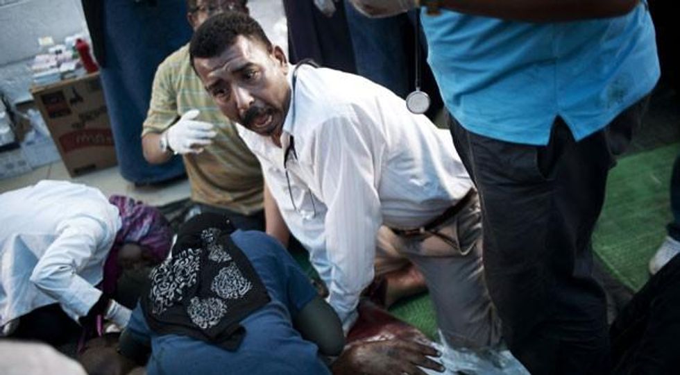 Doctors at the field hospital say they were overwhelmed by the number of casualties that flooded in as the clashes intensified through the early morning. Dr. Mostafa Talaat, a volunteer medic, said most of the gunshot wounds he tended to were in the head, neck and chest. "They were shooting to kill and it seems they used snipers because many of the gunshot wounds had a downward trajectory," indicating they were shot from above, he said.