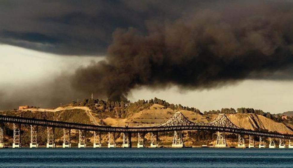 The funny thing about living in the Bay Area is that, whether people love it or hate it, they think it's all treehuggers and antiwar activists here, but considerable machinery for the military, for capitalism, for the violation of human and constitutional rights, and for the war on nature is based here. One place they all converge is Chevron Corporation. The corporation, one of the most powerful on earth, is present here as both a toxic neighbor to the people of Richmond--who doesn't remember that terrible fire that shut down the city for days last summer and sent so many people to the hospital--and as a corrupting force whose huge economic and political influence is used to prevent us from shifting away from a carbon-centered energy economy. Chevron is a menace, to life on earth, to the democratic process that should at the very least be looking after that portion of life on earth called US citizens, to one of the most poorest communities in our rich region.