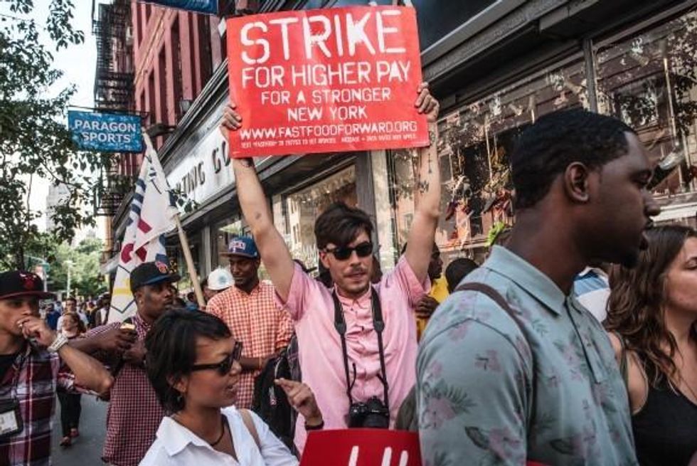That's why, across the country and throughout the week, low-wage fast food and retail employees walked out on strike, calling for $15 an hour and respect for their right to organize a union. Claudette Wilson and her co-workers walked out from a Burger King in Detroit, joined by other fast food workers. Andrew Little and his fellow employees went on strike from Victoria's Secret and other stores and restaurants in Chicago. In St. Louis, members of the United Mine Workers joined employees of Jack in the Box and Hardee's among other fast food franchises in solidarity. And Terrance Wise hit the picket lines in Kansas City on strike from his part-time jobs at Pizza Hut and Burger King. Workers were striking in Flint and Milwaukee as well. Here in New York, I and some Demos colleagues had a chance to join a rally in support of workers at the McDonalds in Union Square (check out the photo).