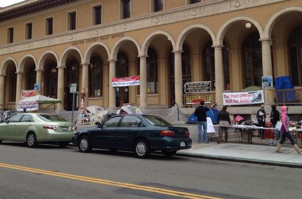 In Berkeley, a group of around twenty people has been sleeping on the post office steps to protest its own corner of the world of privatization, and the activists were joined by 100 people who rallied outside the post office over the weekend to celebrate the resistance.