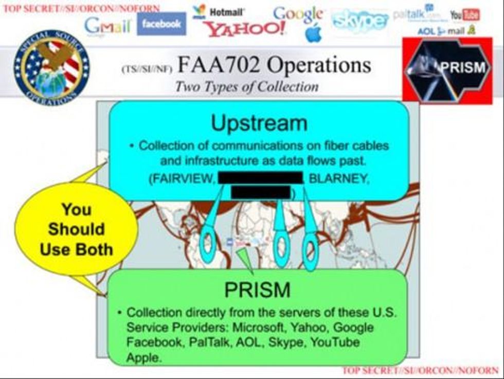 First, notice that they are conflating PRISM--which involves collection from Internet companies like Facebook--with the "upstream" collection the Wall Street Journal reports on: telecommunications companies like AT&T that give the NSA direct access to the fiber optic cables that all Internet traffic travels over. Here's the NSA's own leaked graphic explaining the difference: