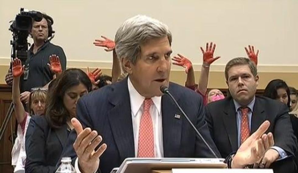 Fast forward to September 3, 2013, and I found myself in a hearing with Secretary of State John Kerry telling members of the Senate Foreign Relations Committee why it was necessary to invade a country that never attacked us: Syria. By now I'm a pro, having attended countless hearings over the last decade. My CODEPINK colleagues and I came prepared. We took out signs that read "Syria Needs a Ceasefire, Not War" and "No US Attack on Syria", and we rubbed red paint on our hands to signify that the blood of Syrians would be on the administration's hands if it went ahead with the attack.