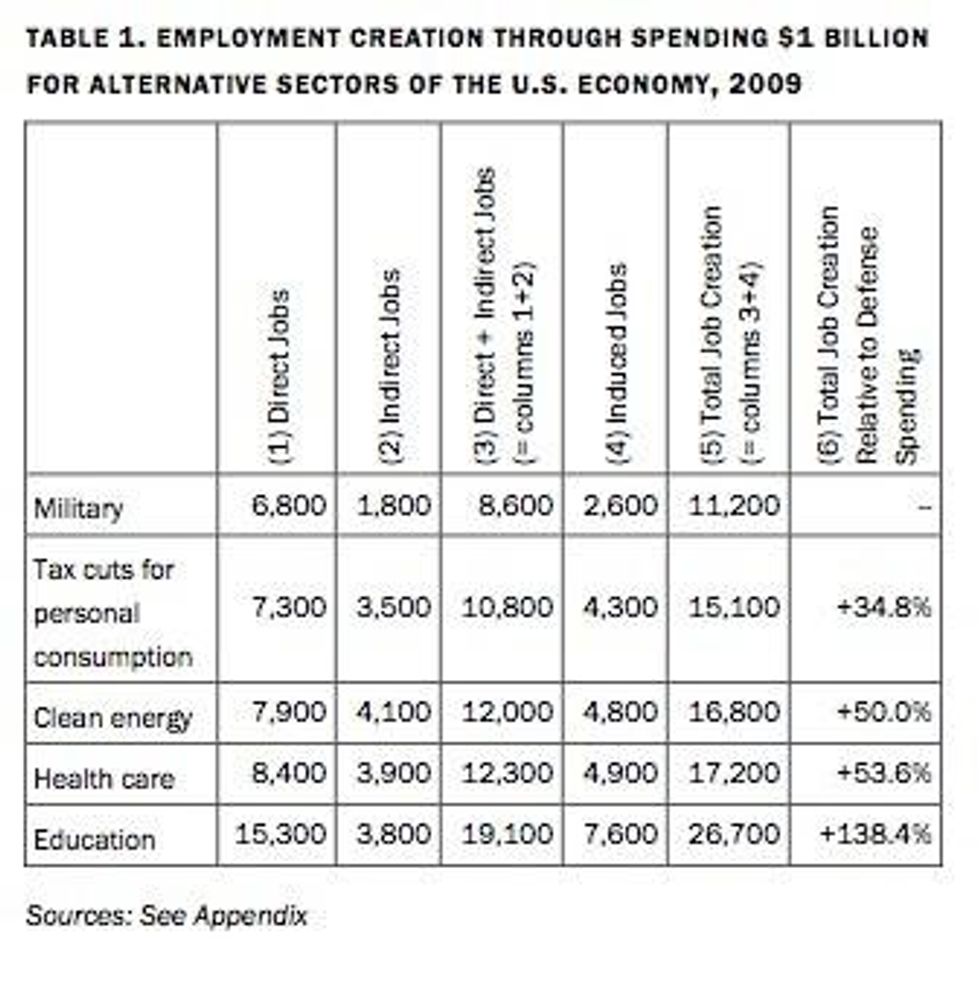 This was documented in a 2011 study by economists Robert Pollin and Heidi Garrett-Peltier at the University of Massachusetts. They showed that if the federal government could borrow and spend a billion dollars, the government would create more jobs by spending the money on education, health care, clean energy, or tax cuts to promote personal consumption (like the payroll tax holiday) than by spending it on the Pentagon.