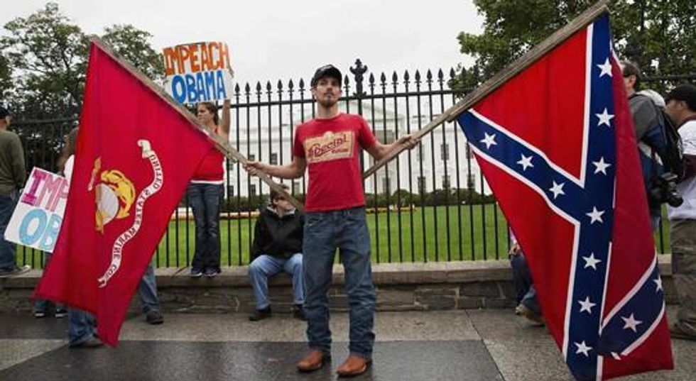 The Obama's-a-foreigner ugliness fermented by Klayman was soon showcased after shutdown protesters marched to the White House where, according to the conservative Washington Times, the crowd numbered "about 200," including curious onlookers. Outside the White House gates, one conservative protester waved a Confederate flag, and when local police arrived to secure the area they were greeted with calls of "brown shirts," while one demonstrator commented the scene "looks like something out of Kenya."