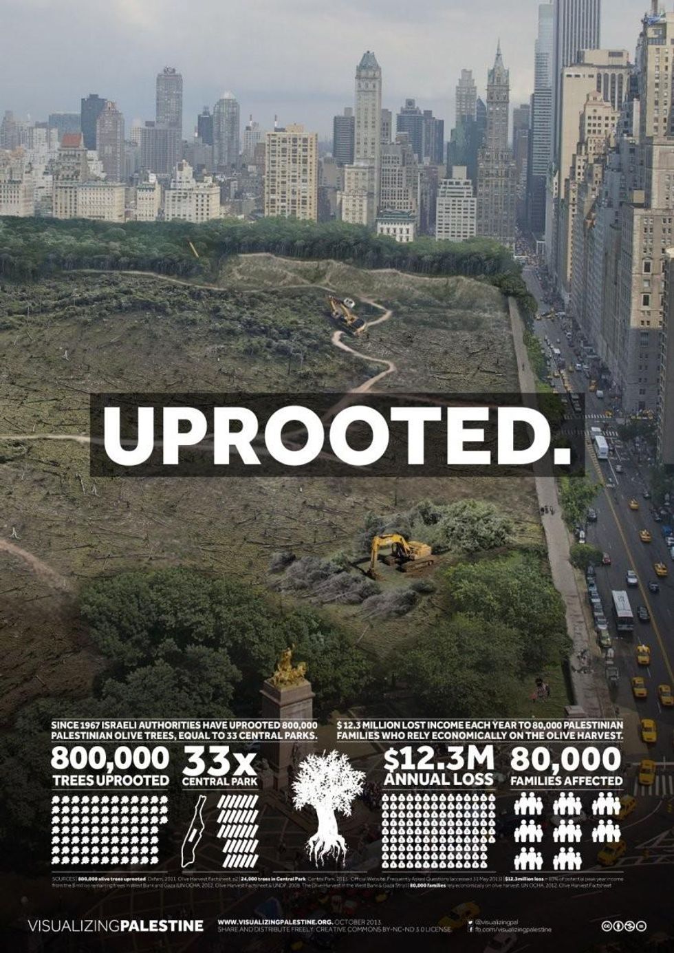 The first is a poster from the campaigning group Visualizing Palestine that shows a photoshopped image of Central Park, eerily naked. Amid New York's skyscrapers, the park has been sheared of its trees by bulldozers. A caption reveals that since the occupation began in 1967, Israel has uprooted 800,000 olive trees belonging to Palestinians, enough to fill 33 Central Parks.