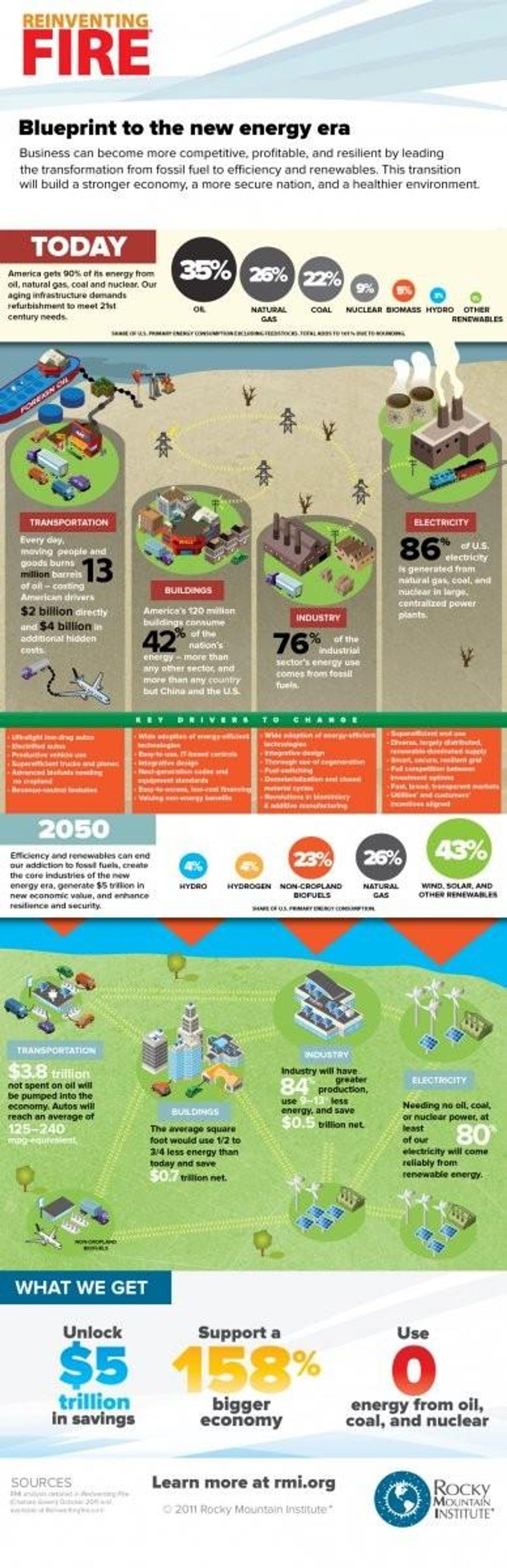 That's just the start. By 2050, the U.S. could triple its energy efficiency, switch supplies from one-tenth to three-fourths renewable, and run a 158% bigger economy with no oil, coal, or nuclear energy and one-third less natural gas. This could cost $5 trillion less than business-as-usual, emit 82-86% less fossil carbon, need no new inventions nor Acts of Congress, and be led by business for profit. The 2011 book Reinventing Fire by Rocky Mountain Institute (RMI) details how.